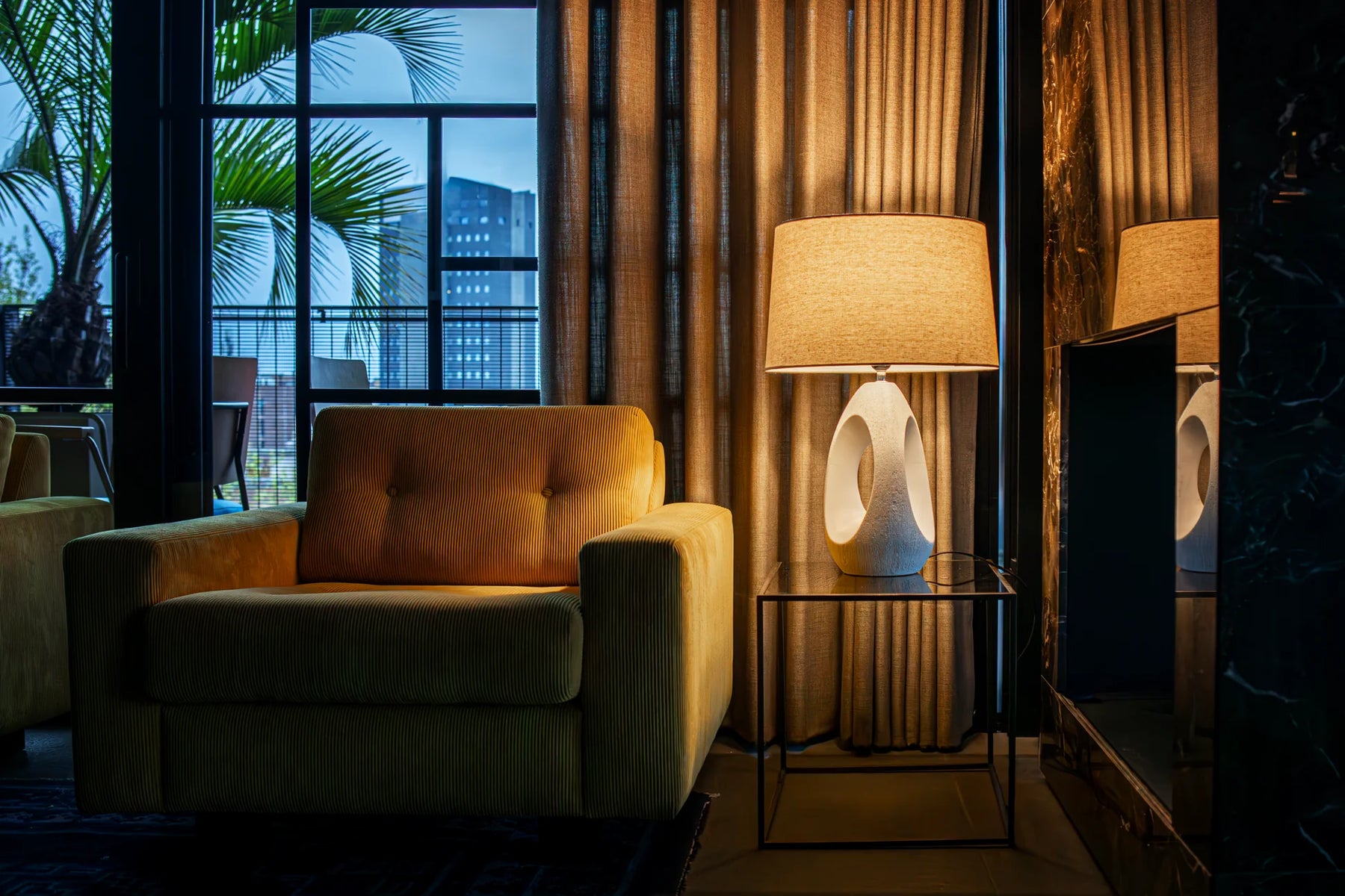 Design con un modulo decorativo e raffinato a rilievo, proposta in due misure con paralume in tessuto.