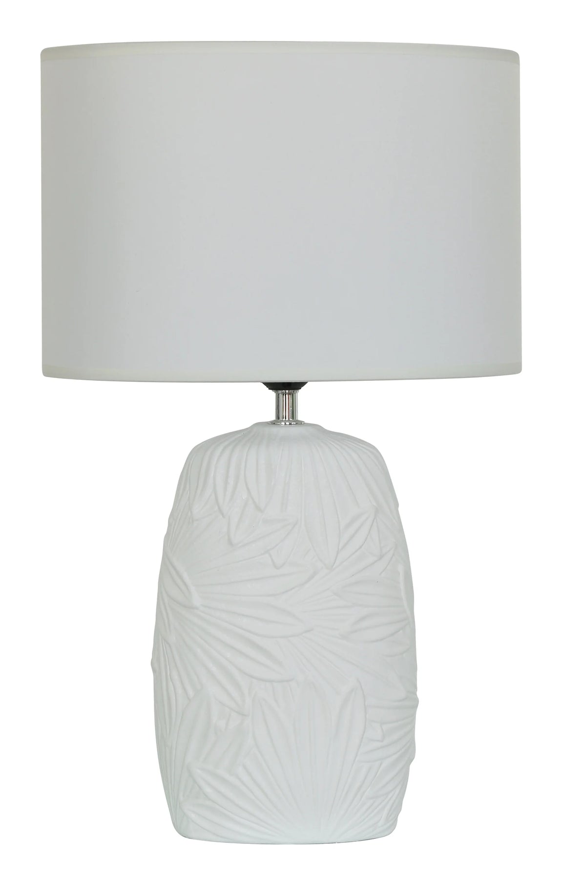 Design con un modulo decorativo e raffinato a rilievo, proposta in due misure con paralume in tessuto.