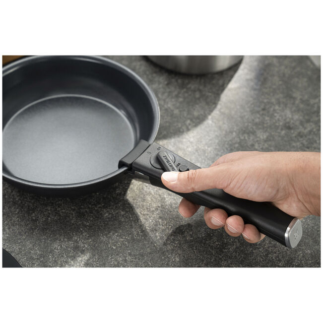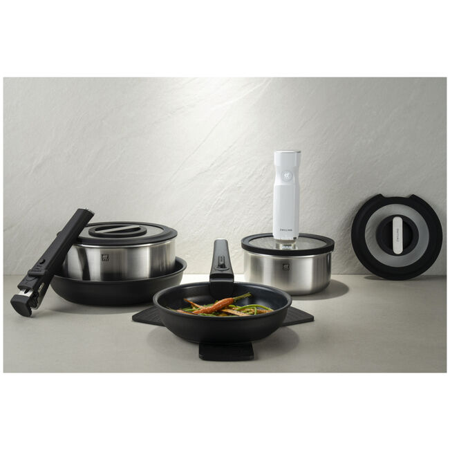 Il sistema tutto in uno ZWILLING UNLOCK offre le massime prestazioni nel minimo spazio. Le tre padelle (20, 24 e 28 cm) possono essere impilate per risparmiare spazio grazie al manico rimovibile, ideale per cucine compatte. Il rivestimento in ceramica rinforzato al titanio CERAFORCE è prodotto senza PFAS, per proprietà antiaderenti durature e prestazioni di cottura senza pensieri. Il fondo a induzione Radiant garantisce un riscaldamento rapido, una distribuzione uniforme del calore e risultati eccellenti. E dopo la cottura si può comodamente lavare in lavastoviglie. Oppure con il coperchio sottovuoto adatto al frigorifero, senza necessità di scomodi travasi. ZWILLING UNLOCK: per chef che sognano in grande e vogliono la massima flessibilità in uno spazio ridotto.