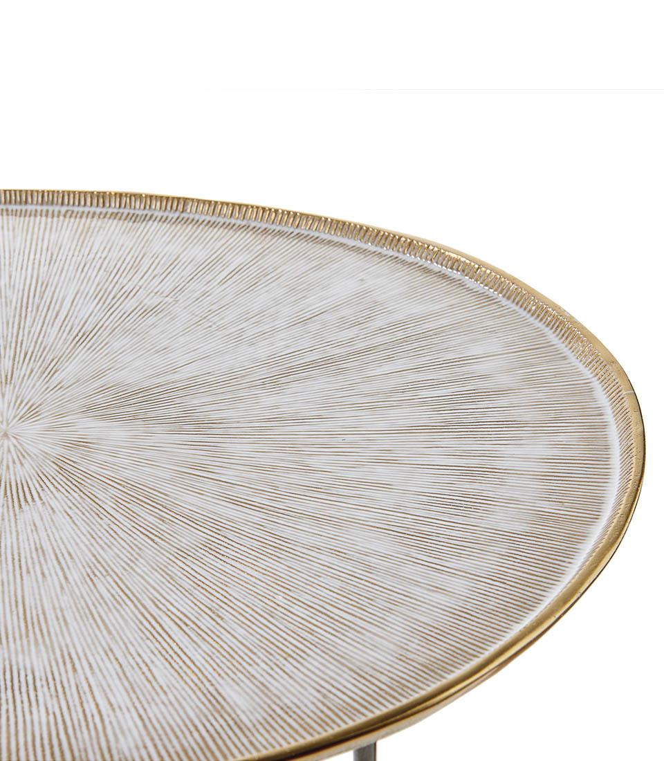 Tavolino medio in alluminio con piano decorato. Un dettaglio dal design ricercato e contemporaneo per gli amanti dello stile moderno. Da abbinare al tavolino piccolo e grande dell'ispirazione Contemporaneo per una composizione poliedrica e sempre originale.