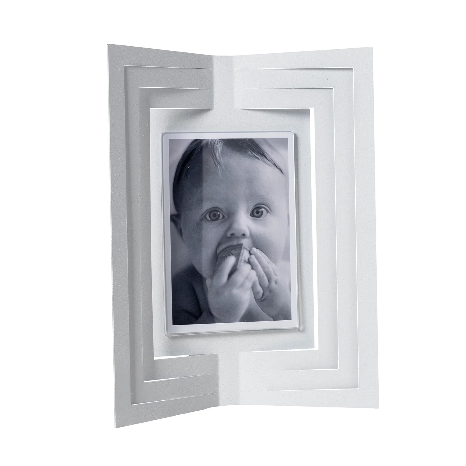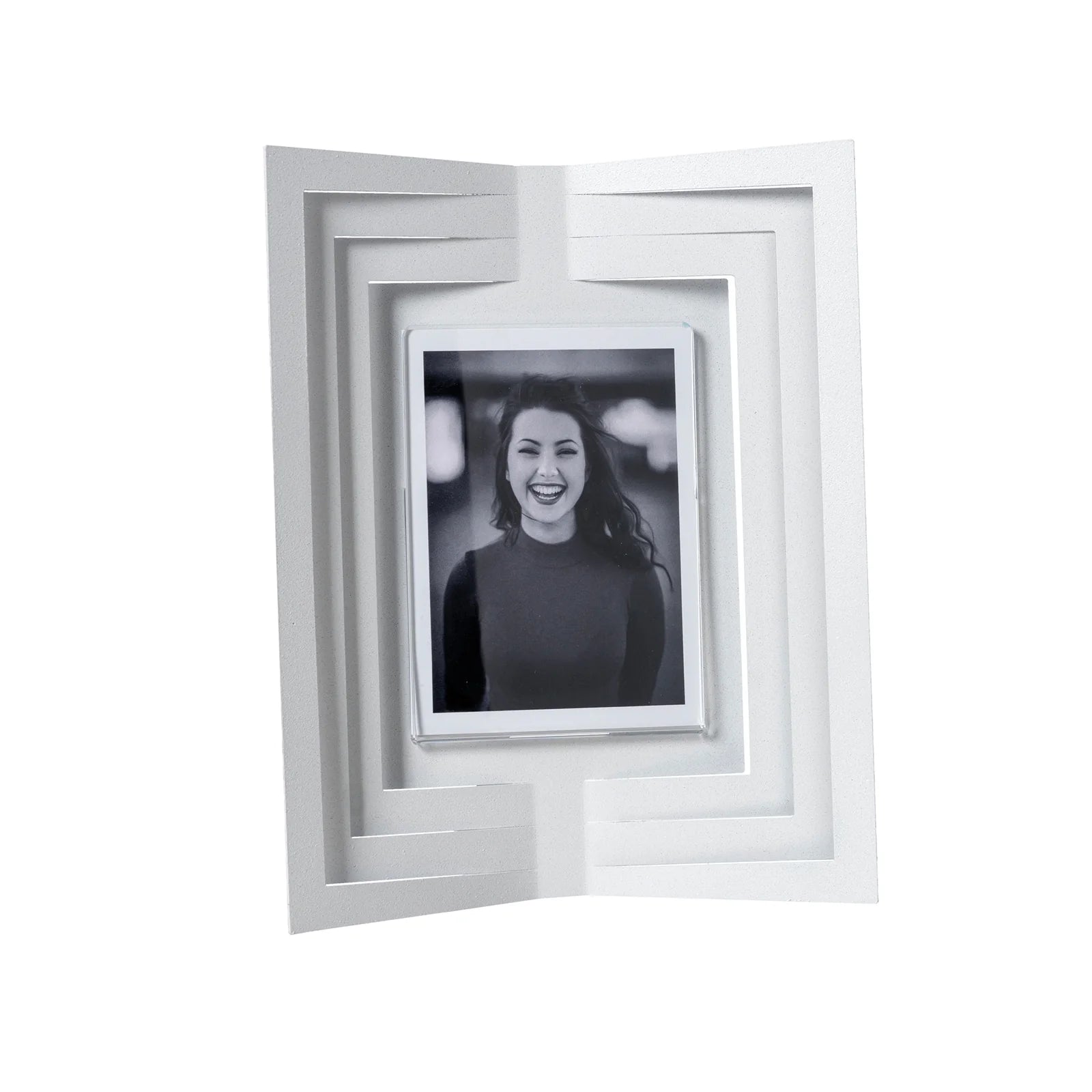 Il portafoto Vibra piccolo offre un design dallo stile geometrico e pulito, con le sue linee squadrate che si piegano verso l'interno, creando un effetto di movimento e dinamismo.